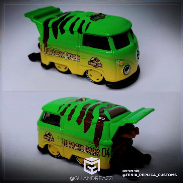 Desenhado em cima de um modelo Volkswagen Kool Kombi da Hot Wheels, este decalque emula um design temático dos Jeeps do filme Jurassic Park