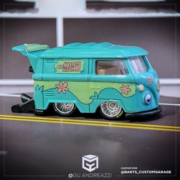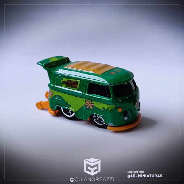 Desenhado em cima de um modelo Volkswagen Kool Kombi da Hot Wheels, este decalque emula um design temático da Máquina do Mistério.