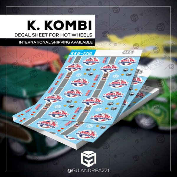 Desenhado em cima de um modelo Volkswagen Kool Kombi da Hot Wheels, este decalque emula o design temático do time de basquete Harlem Globetrotters.