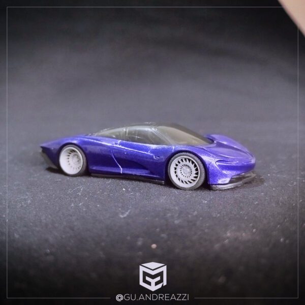 Rodas impressas em resina 3D com design baseado em rodas utilizadas em miniaturas esportivas de grupos estrangeiros.