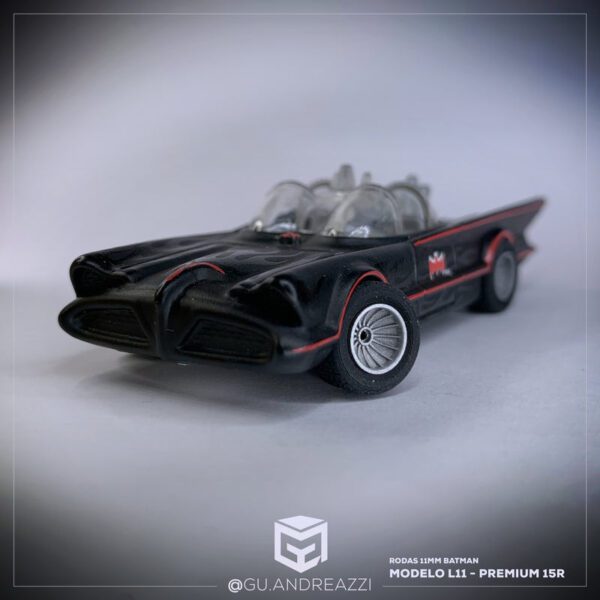 Rodas impressas em resina 3D com design baseado nas rodas originais Hot Wheels utilizada em miniaturas antigas e temáticas. Esse desenho é mais conhecido por ser utilizada em uma das versões do Batmóvel.
