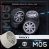 Rodas impressas em resina 3D com design baseado em rodas utilizadas em caminhonetes.