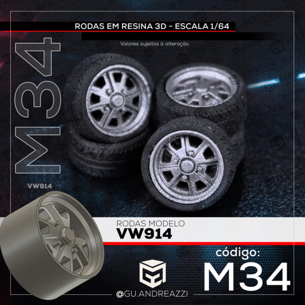 Rodas impressas em resina 3D com design baseado nas rodas originais do Porsche 914, muito utilizado em Fuscas.