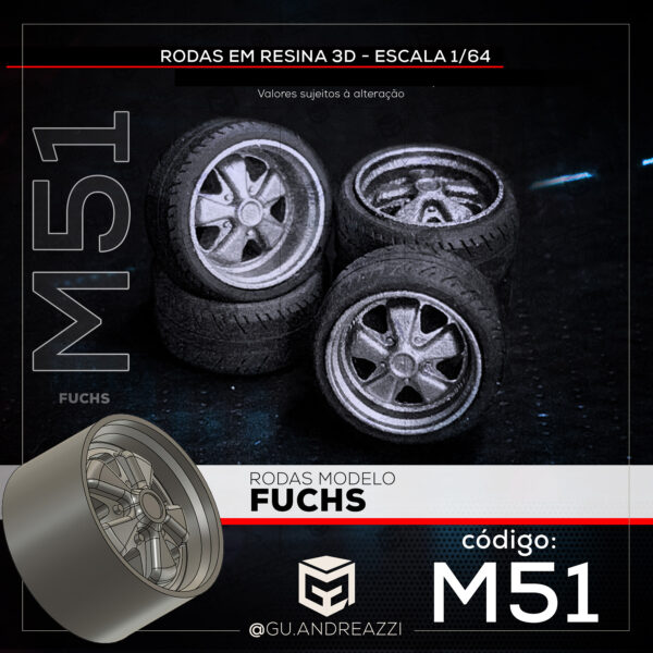 Rodas impressas em resina 3D com design baseado nas rodas Fuchs, comumente vistas em Porsches e Fuscas antigos