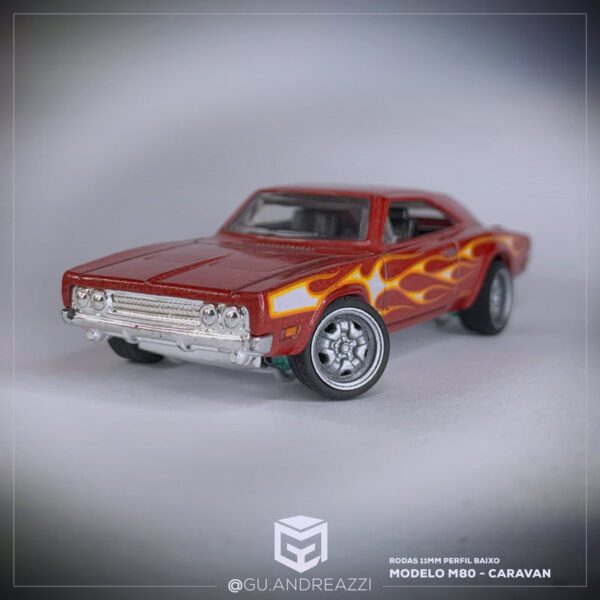 Rodas impressas em resina 3D com design baseado em rodas da chevy dos anos 70 que geralmente equipavam Opalas e Caravans.