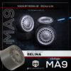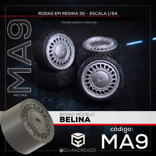 Rodas impressas em resina 3D com design baseado na roda Oem da Belina.