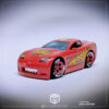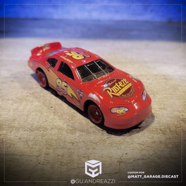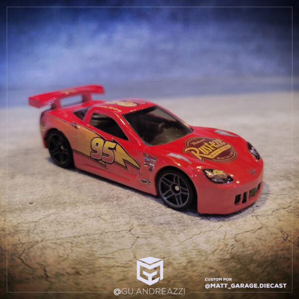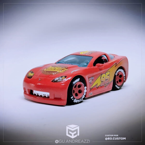 Montado em cima de um Corvete C6 da Hot Wheels, este decalque emula o design que aparece no filme, incluindo todos os patrocinadores e layout do vinil com a maior fidelidade possível. Relâmpago McQueen foi inspirado no piloto de NASCAR Jeff Gordon.