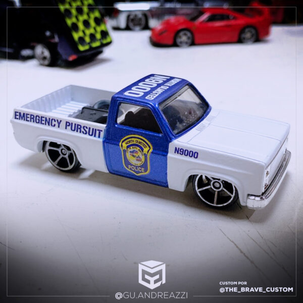 Montado em cima de uma Chevy Silverado da Hot Wheels, este decalque contém a arte completa do carro conforme lançado originalmente como Emergency na linha Cop Rods.