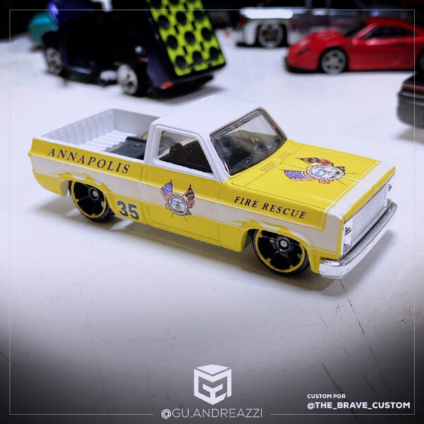 Montado em cima de uma Chevy Silverado da Hot Wheels, este decalque contém a arte completa do carro conforme lançado originalmente como Fire na linha Cop Rods.