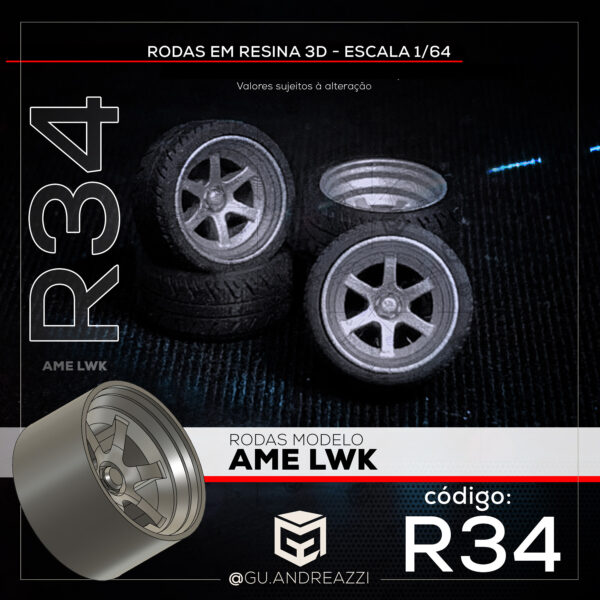 Rodas impressas em resina 3D com design baseado nas rodas AME utilizadas em carros LBWK.
