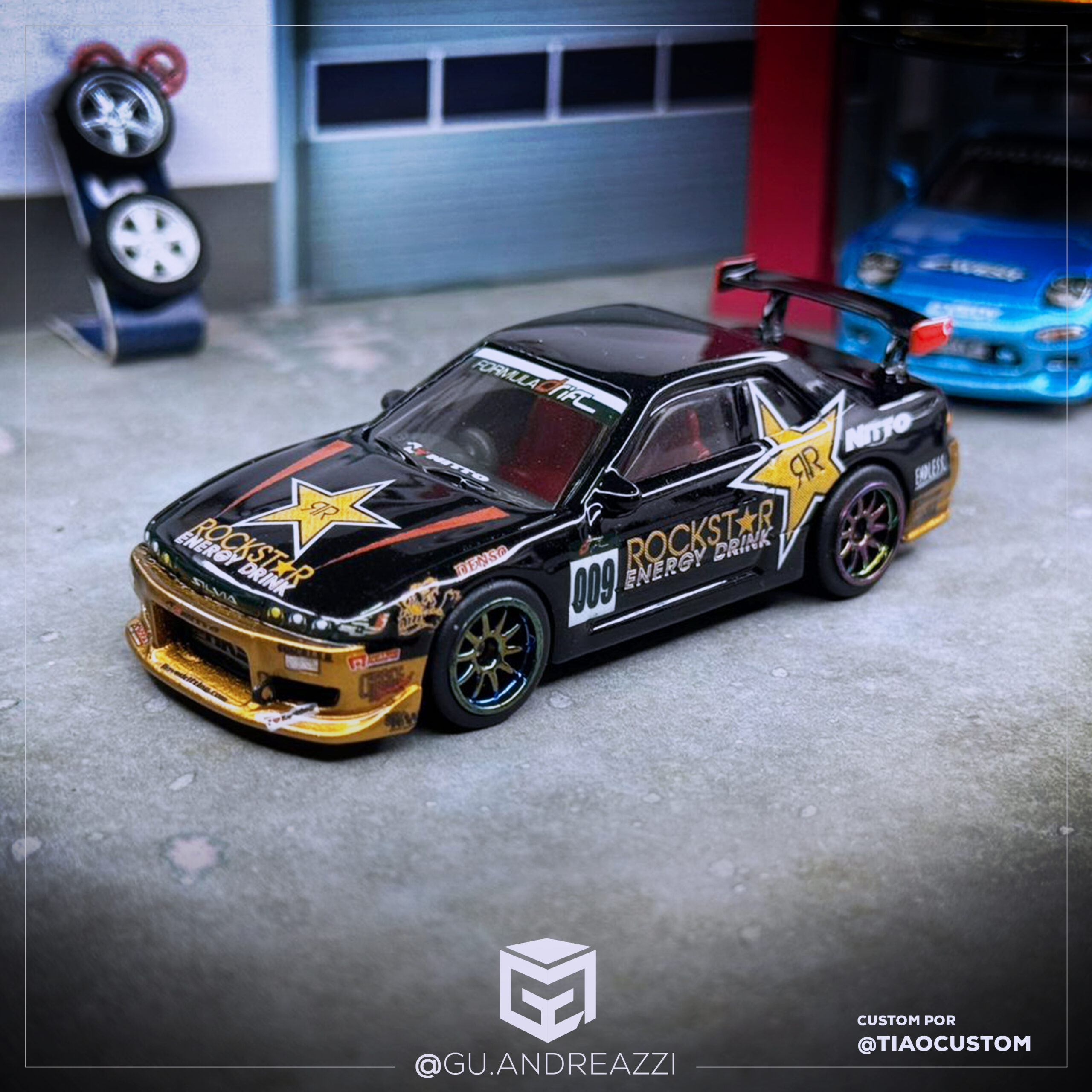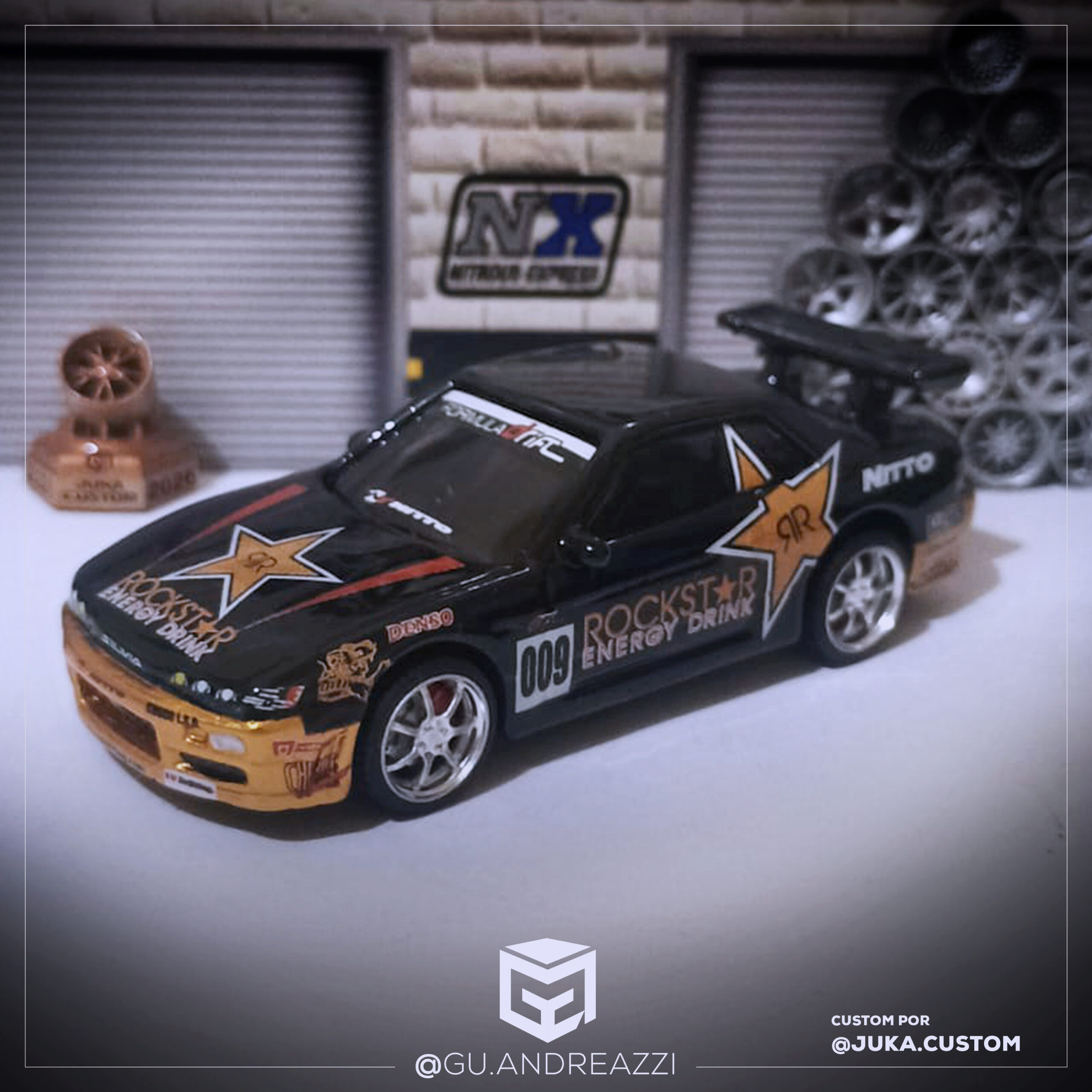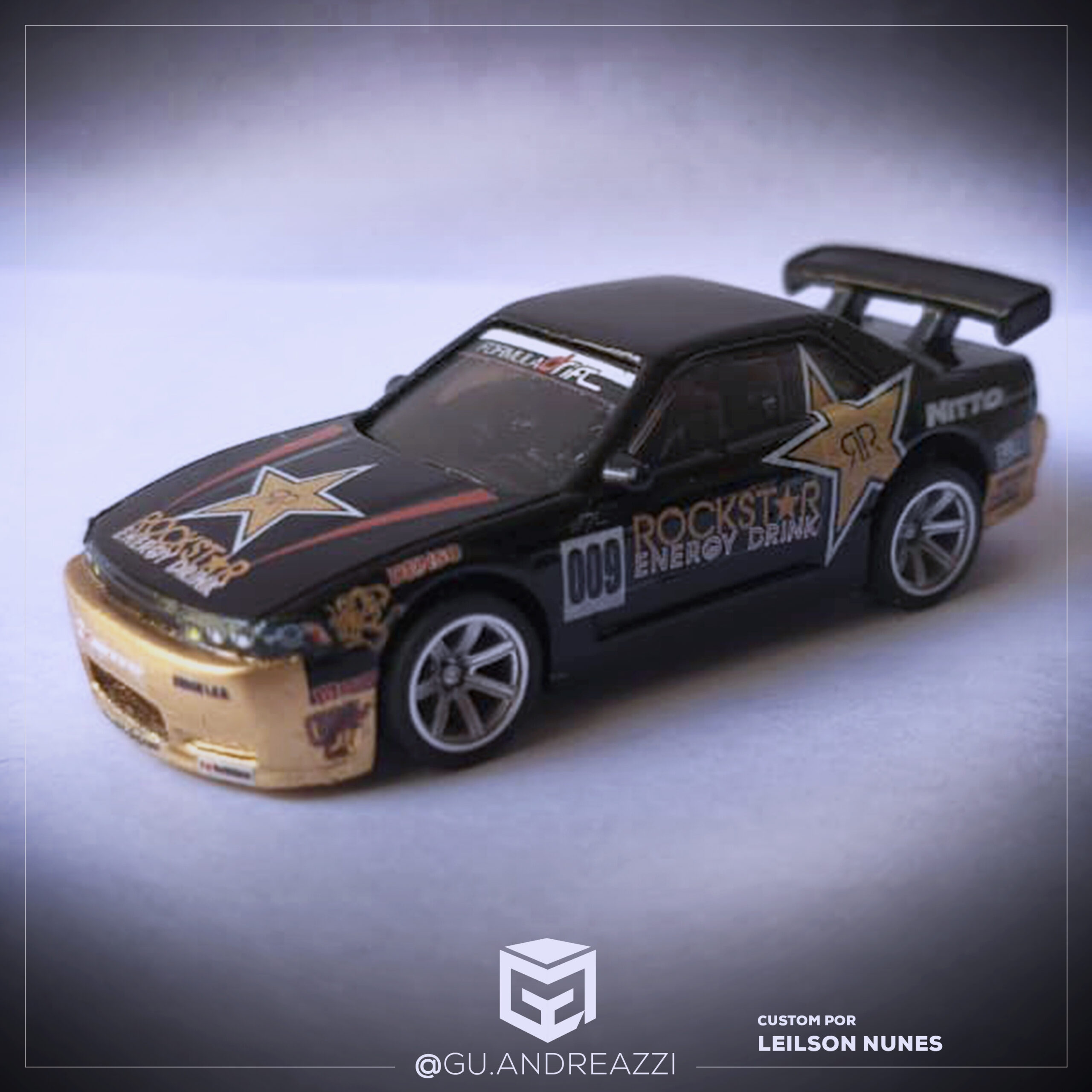 Desenhado em cima de um Nissan Silvia S13 da Hot Wheels, este decalque emula a arte da marca Rockstar.