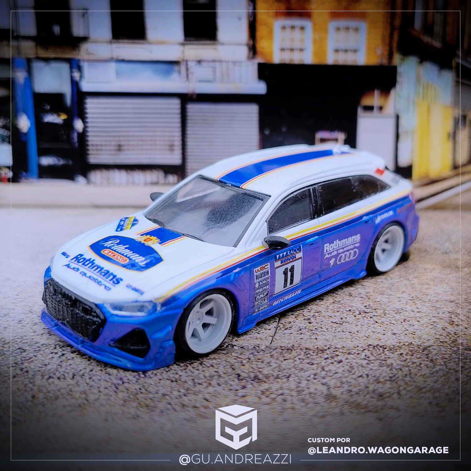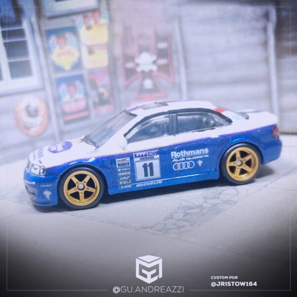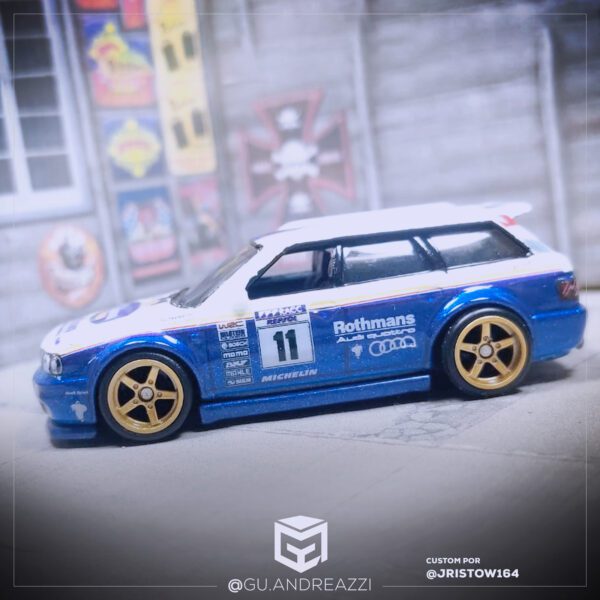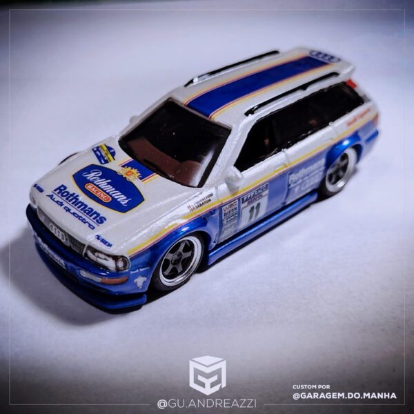 Decalque desenhado com referência ao design clássico Rothmans, adaptado em uma Audi RS2 da Hot Wheels.