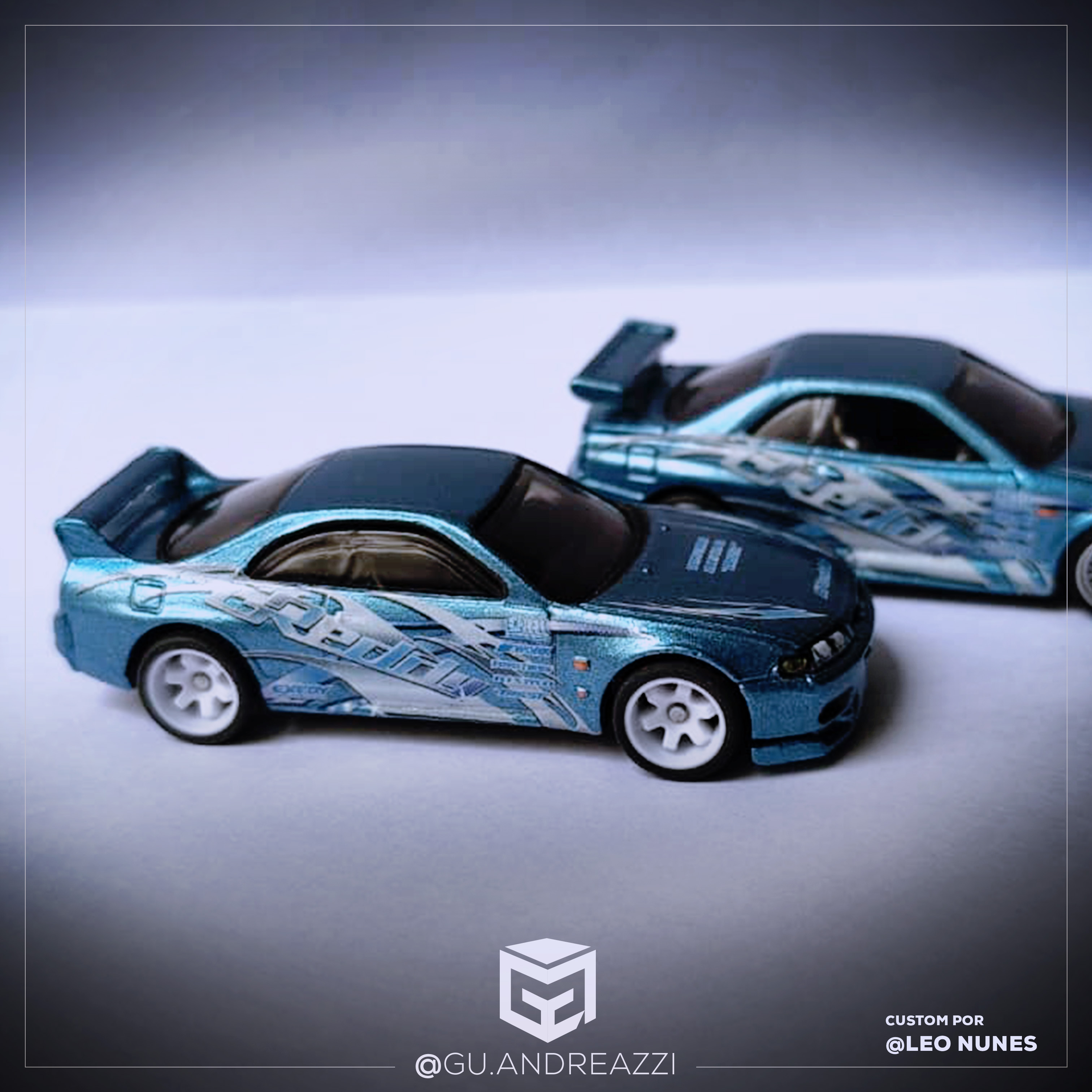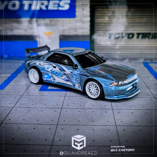 Desenhado em cima de um modelo Hot Wheels, este decalque replica o padrão visual de um carro de drift, com patrocínio genérico da GReddy