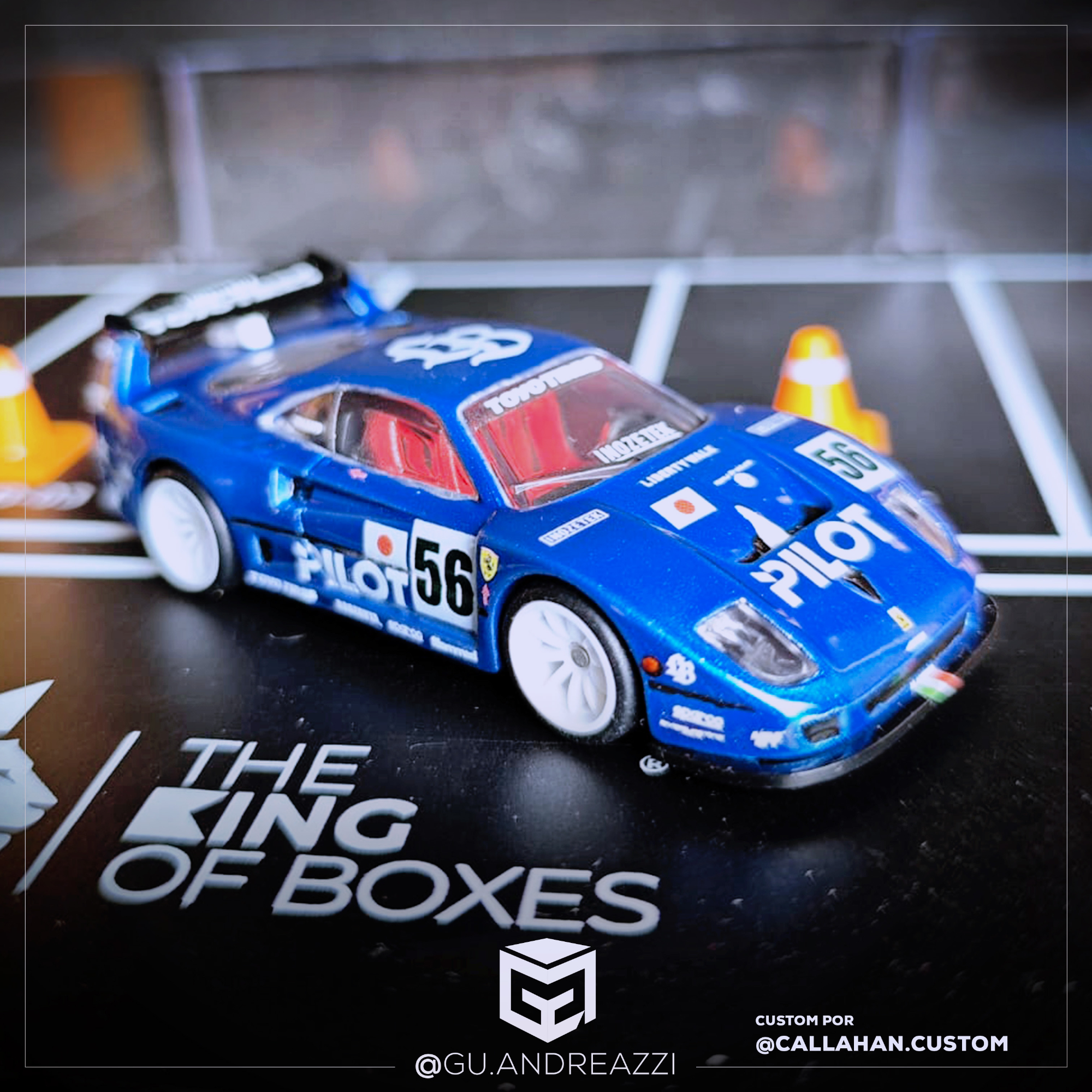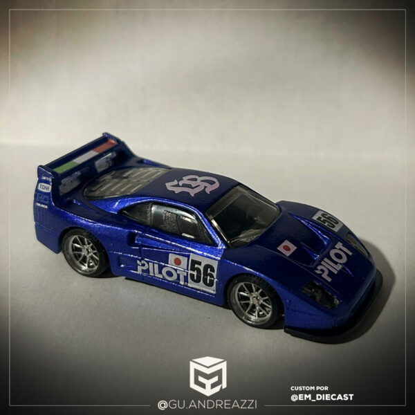 Desenhado em cima de um modelo Hot Wheels, este decalque replica o padrão visual da Ferrari F40 azul Liberty Walk.
