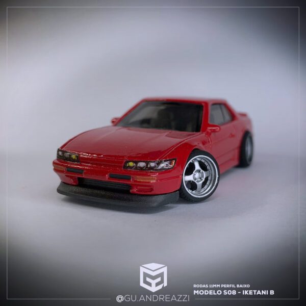Rodas impressas em resina 3D com design baseado nas rodas SSR Mark II R, mais conhecidas por terem sido usadas no icônico Nissan Silvia S13 guiado por Iketani no anime Initial D.