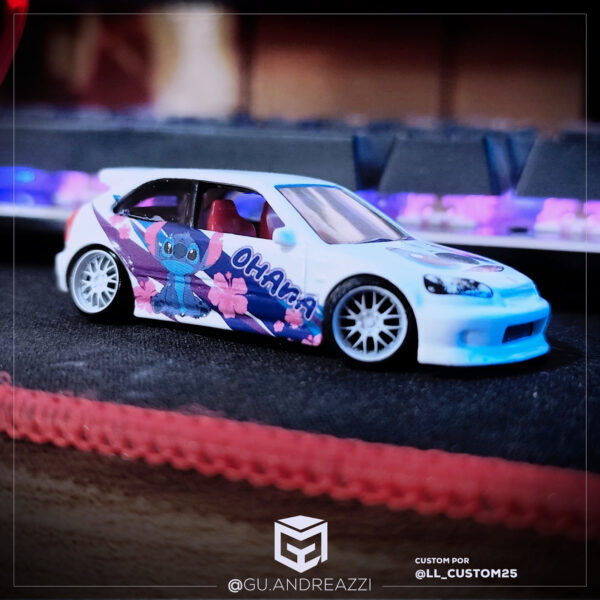 Decalque desenhado para adaptar uma arte de Lilo & Stitch à um Civic Type R da Hot Wheels.