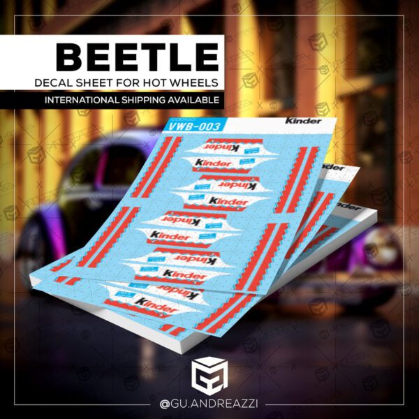 Desenhado em cima de um modelo VW Beetle da Hot Wheels, este decalque replica os clássicos painéis laterais do fusquinha, mas com o logo da Kinder Ovo.