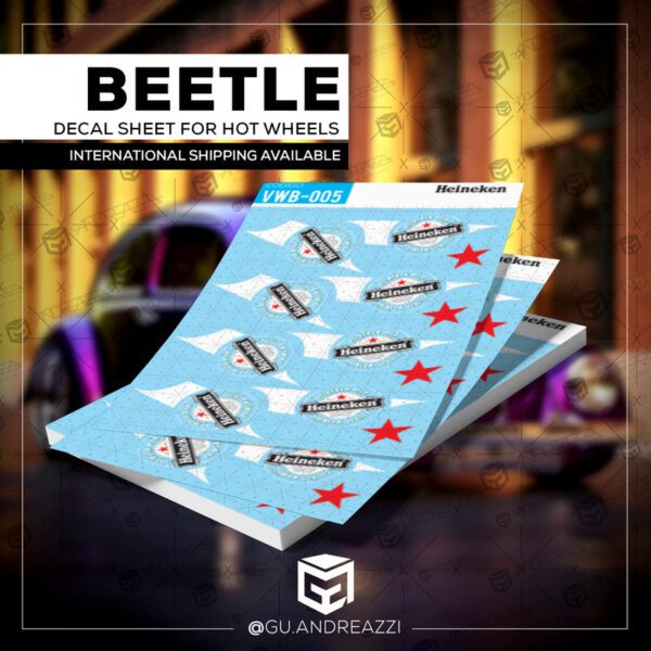 Desenhado em cima de um modelo VW Beetle da Hot Wheels, este decalque replica os clássicos painéis laterais do fusquinha, mas com o logo da cerveja Heineken.