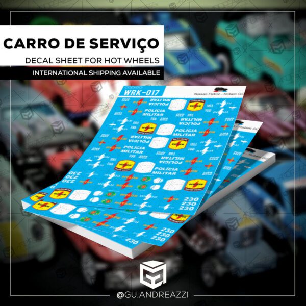 Desenhado em cima de um modelo Nissan Patrol da Hot Wheels, este decalque replica todos os elementos do carro de serviço da Polícia Militar do Goiás.